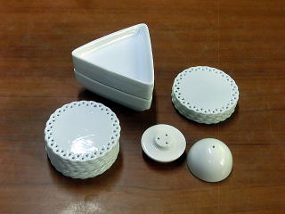 |  四角透かしボール 白磁 大160×160×50mm 600円 SA95 中120×120×40mm 300円SA96在庫切れ 小60×60×30mm 200円 SA97 特価品 鋳込み作り |  丸 四角 楕円透かしボール (小) 丸 72×20mm 200円 SA91在庫切れ 四角60×60×30mm200円SA97 楕円 小60×80×30mm 200円SA94 特価品 鋳込み作り | |